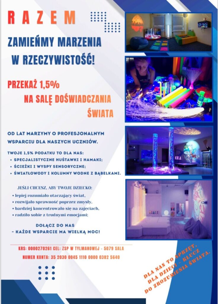 zapraszam i proszę Was o przekazanie 1,5% podatku na nową inicjatywę, która zrodziła się w moim umyśle i sercu na podstawie obserwacji i rozmów z dziećmi, uczniami, nauczycielami i oczywiście Wami. Chodzi o stworzenie i wyposażenie sali doświadczania świata.
